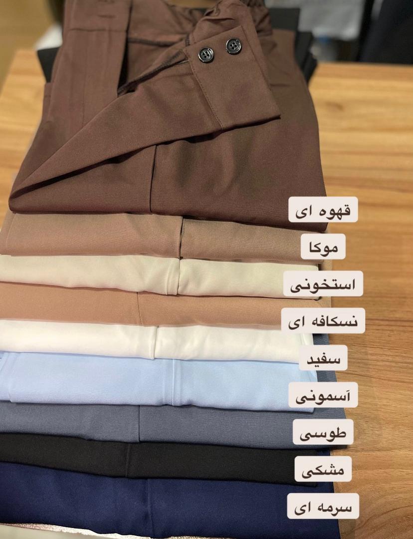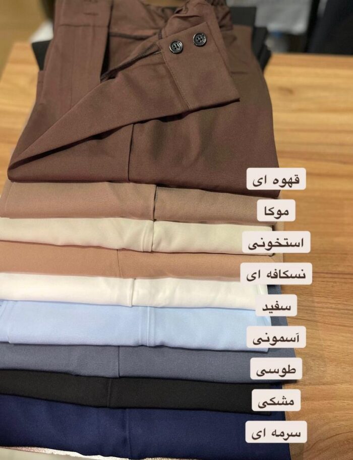 آبی آسمانی, سرمه ای, سفید, طوسی, قهوه ای, مشکی, نسکافه ای, استخونی, موکا |